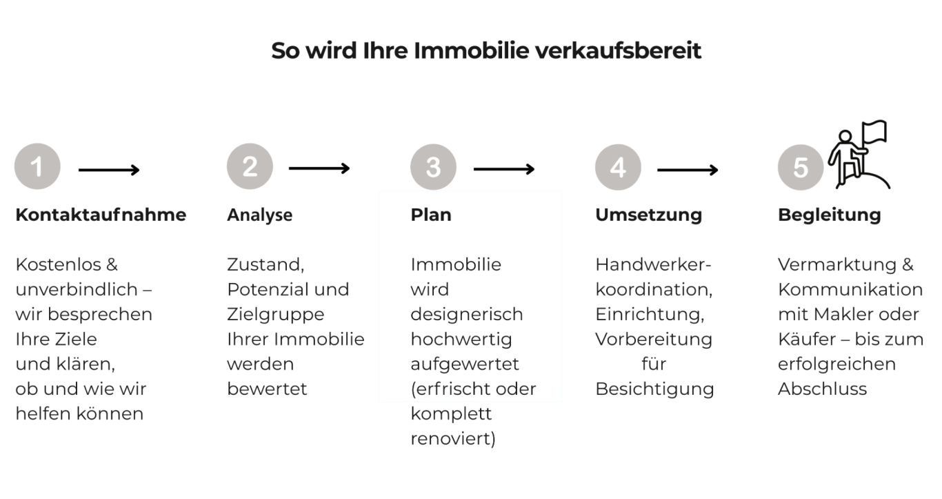 Sie können entspannt Ihrem Alltag nachgehen, während wir Ihre Immobilie Schritt für Schritt verkaufsbereit machen.